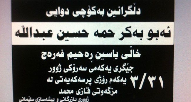 پاش کۆچی دوای(حاجی خورشی فەتاح) دایکی بەڕێزتان بەناوی تەواوی کارماندان و ئەندامانی ئەنجومەنی ژووری بازرگانی و پیشەسازی سلێمانیەوە پرسەو سەرەخۆشی خۆمان ئاڕاستەی بەڕێزتان و خانەوادەکاتان دەکەین.